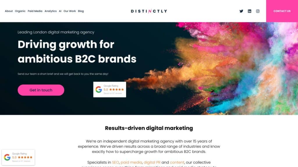 Distinctly blends data‑led ideation with close journalist relationships to secure topical coverage, while its analytics team connects earned links to measurable performance uplift. Transparency and education sessions set expectations from day one.